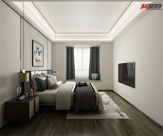 設計師采用東方的和雅蘊涵,靈活運用中式的瓷器擺件,以藝術書寫耳目一新的篇章,營造出高尚風雅的的東方人居環境。實木床頭柜搭配金屬線條,在中式的元素中融入現代因子,大方美觀。主臥整體簡潔素雅,冷色調幫助睡眠安定心神。
