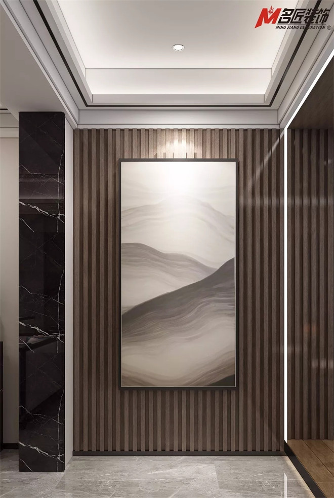 整體效果現代新中式美學別有一番味道,每一處都透露著對東方雅致生活意境的美好向往。入戶的玄關木飾與背景均攜帶著東方詩性的紋路,流露出新中式大度的優雅風骨。