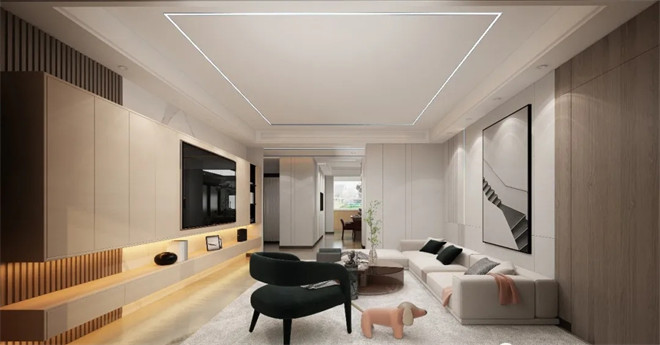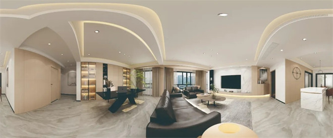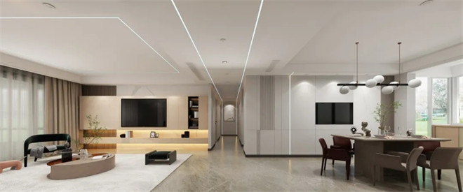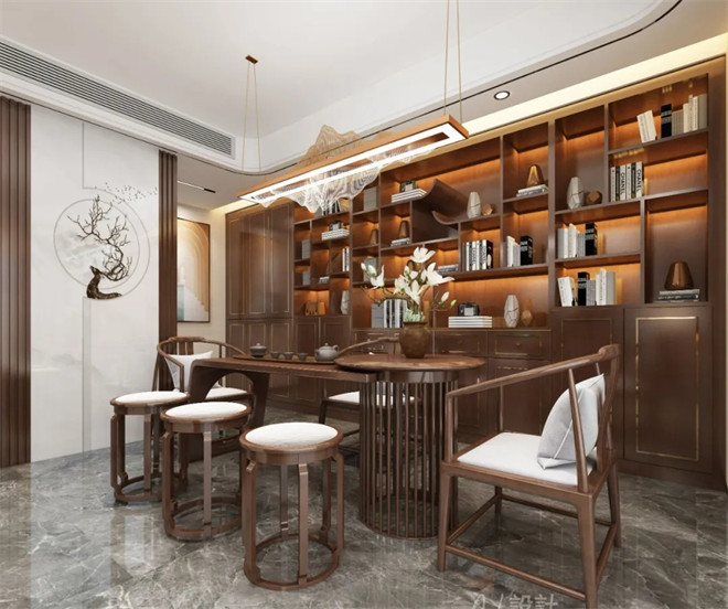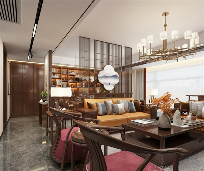 整個開放式的空間極具開放性,在簡潔的基調上,利用現代和新中式風的家具、燈具及飾品裝飾出新古之韻的雅宅。