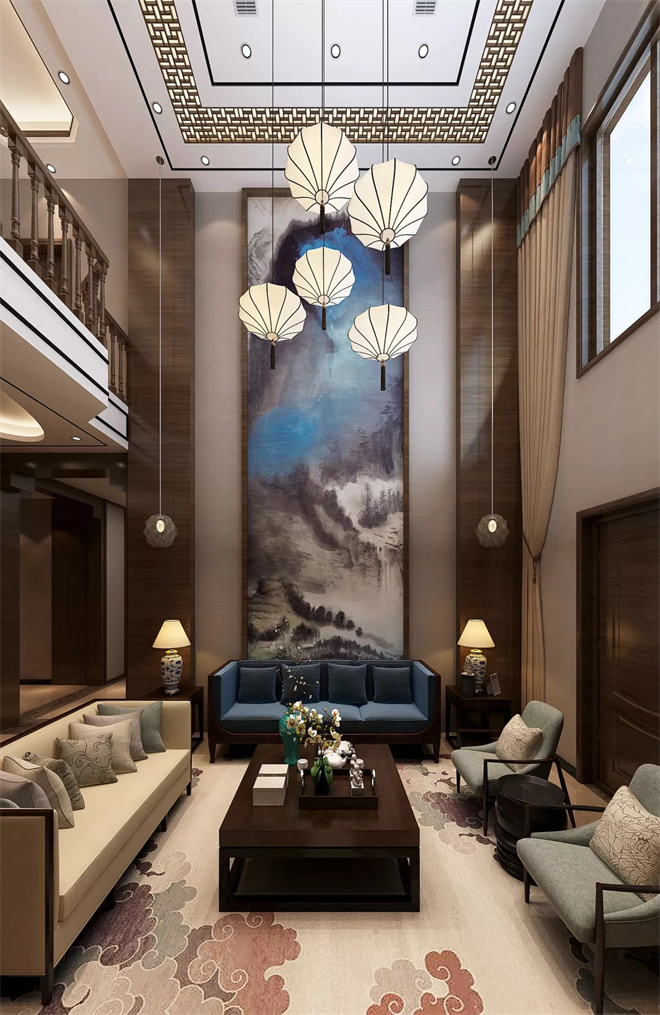 兩層樓高的客廳大氣磅礴,前后結構對稱,不同造型的新中式燈具加上巨幅山水畫。客廳空間非常開闊,四面通透,中式的大圓桌象征了一家人和和美美